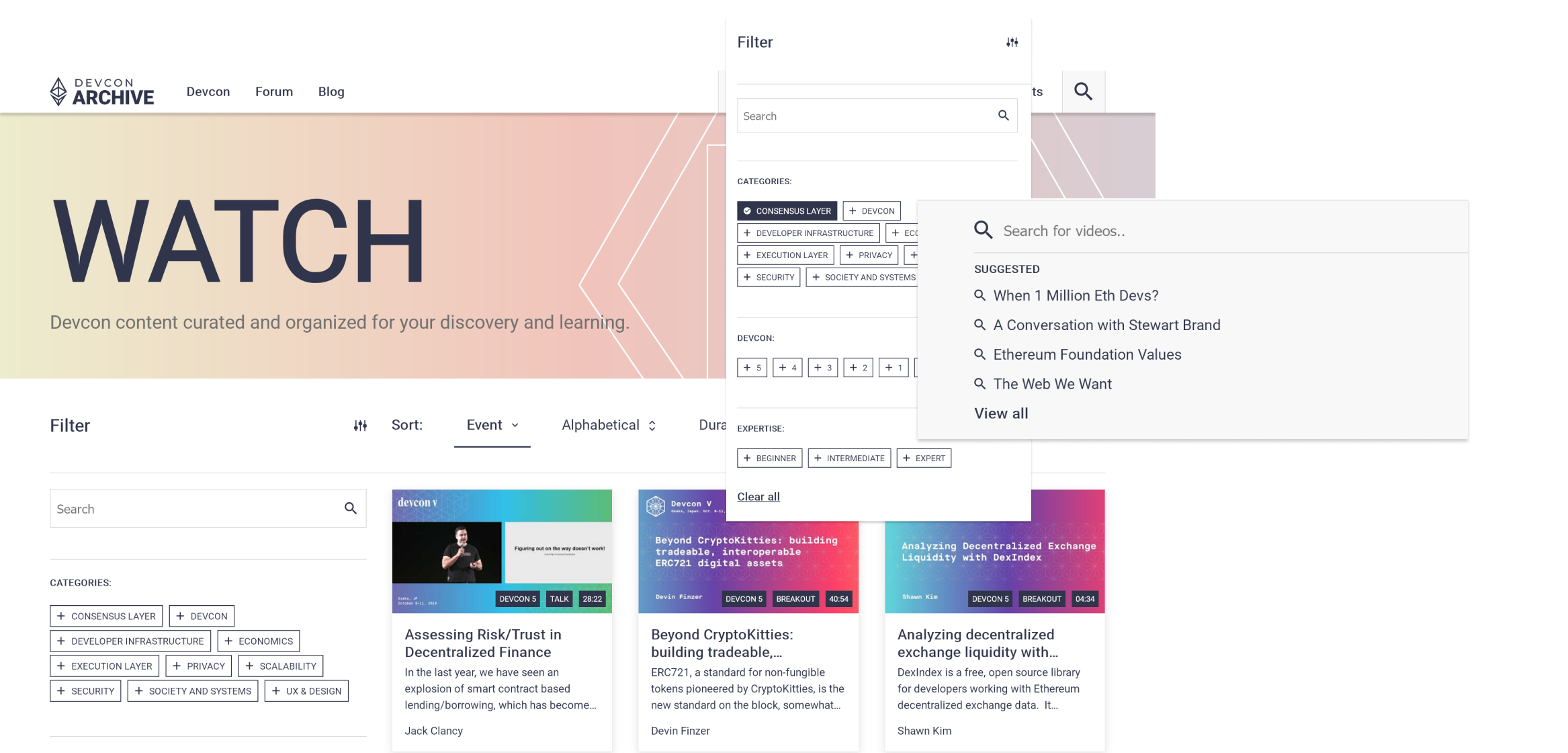 From a user-perspective, our goal was to make the Devcon archive be as easy as possible to navigate, filter, and access content based on your specific interest and skill level.