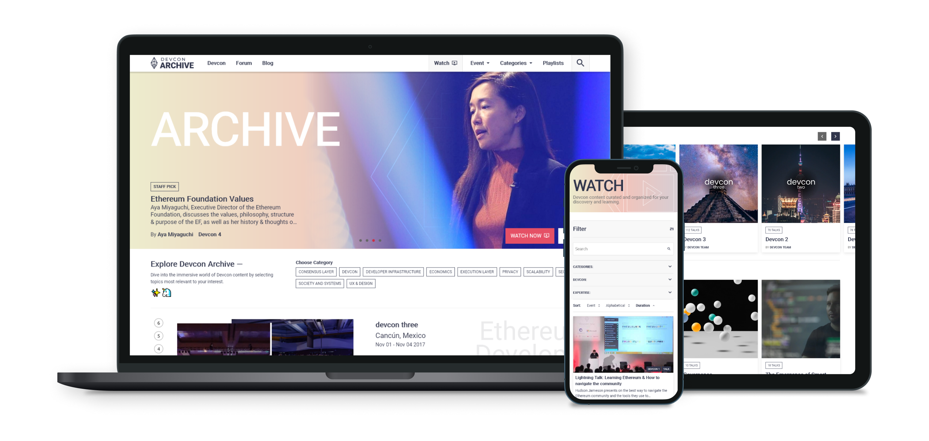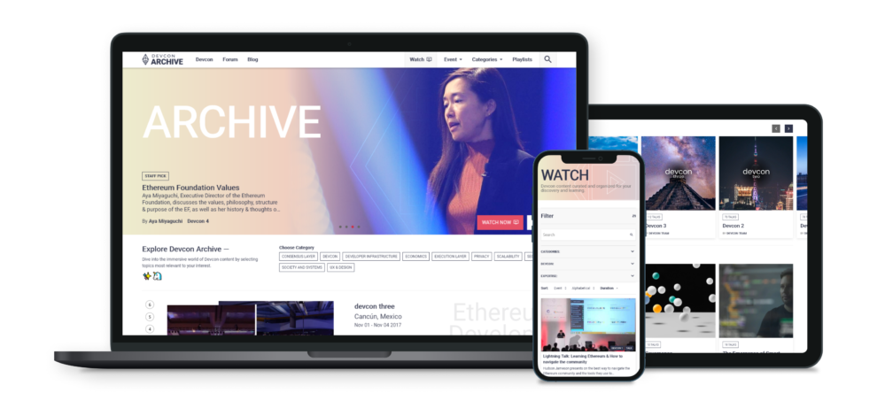The new archive has been rebuilt from the ground up with a mobile-first implementation, allowing you to access your favorite Ethereum developer content on any device. Due to the comprehensive amount of metadata now available on the archive, you are able to search and filter videos with a variety of inputs. Easily search content based on the speaker, talk descriptions, devcon tracks, keywords, level of expertise or the Devcon event editions. You can also access a wide array of curated and suggested playlists to help discover interesting and engaging content.