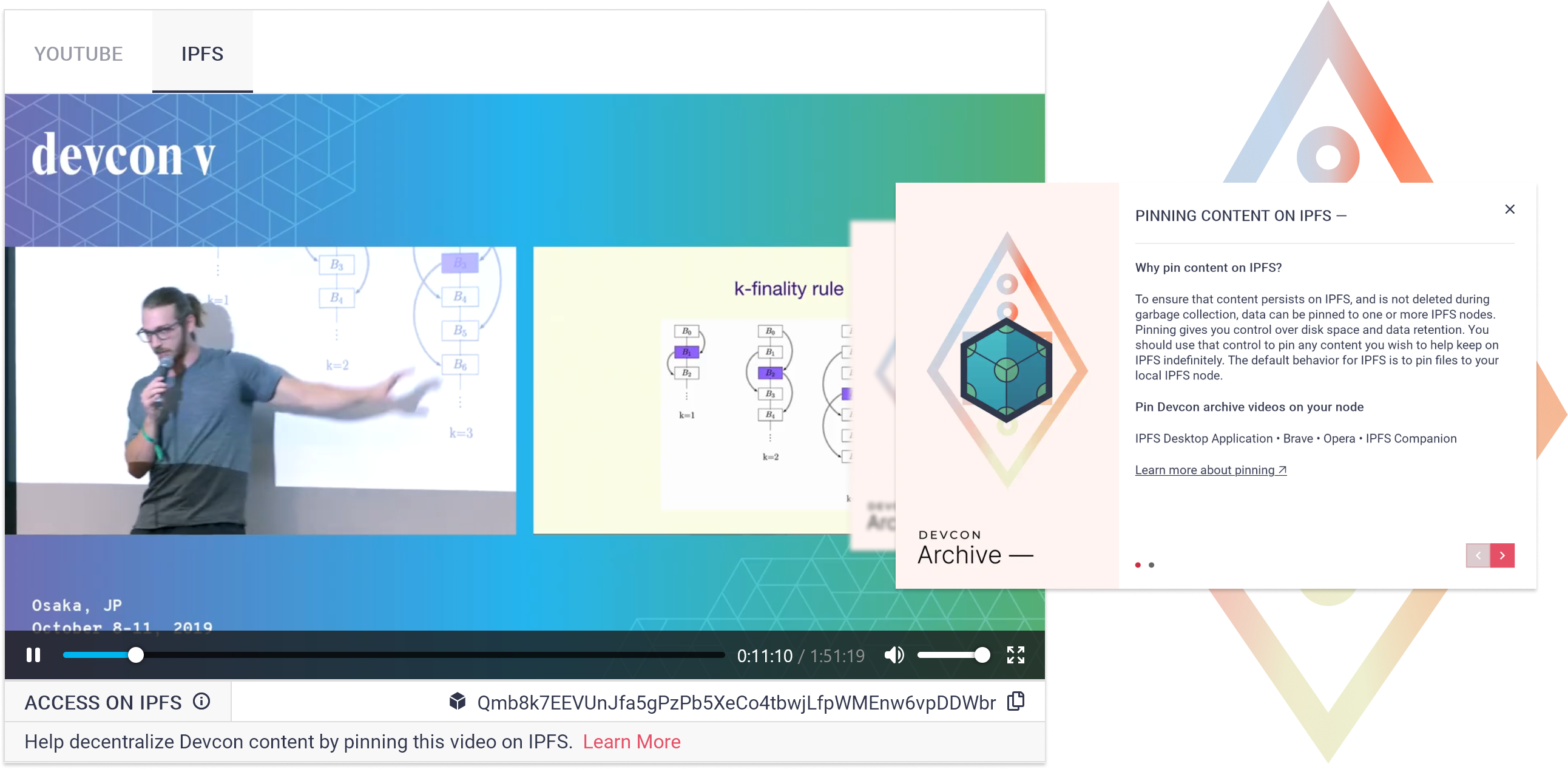 For this reason, we decided to fully integrate IPFS as a part of the Devcon archive experience. IPFS is a distributed system for storing and accessing files, websites, applications, and data. Learn more about IPFS here. You can now find all the past Devcon content hosted on IPFS, and easily accessible through the archive via the IPFS video player tab. We also hope to see users pin their favorite content on IPFS to make it more accessible, and to signal their preference around the type of content they enjoy the most and wish to share with others.
