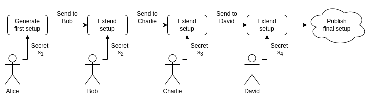 It’s a multi-party ceremony: each contributor creates a secret and runs a computation to mix it with previous contributions. Then, the output is made public and passed to the next contributor. The final output will be included in a future upgrade to help scale the Ethereum network.
