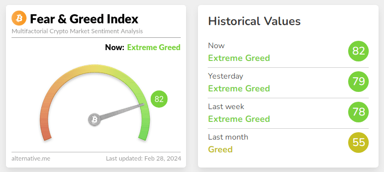 In the meantime, on Wednesday, the Fear and Greed Index—a sentiment indicator that measures how quickly asset movement deviates from underlying fundamentals—flashed 82, signaling “extreme greed” and hitting its highest level in more than a year.