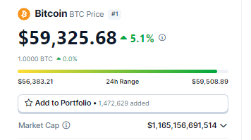 Bitcoin fast approaching the $60K level. Source: Coingecko