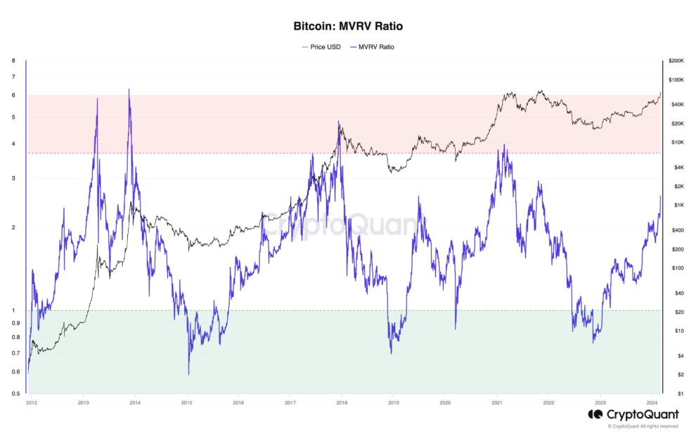 As pointed out by CryptoQuant founder and CEO Ki Young Ju in a post on X, the MVRV ratio has just hit a value of 2.5. The “Market Value to Realized Value (MVRV) ratio” is a popular on-chain indicator that keeps track of the ratio between the Bitcoin market cap and the realized cap.