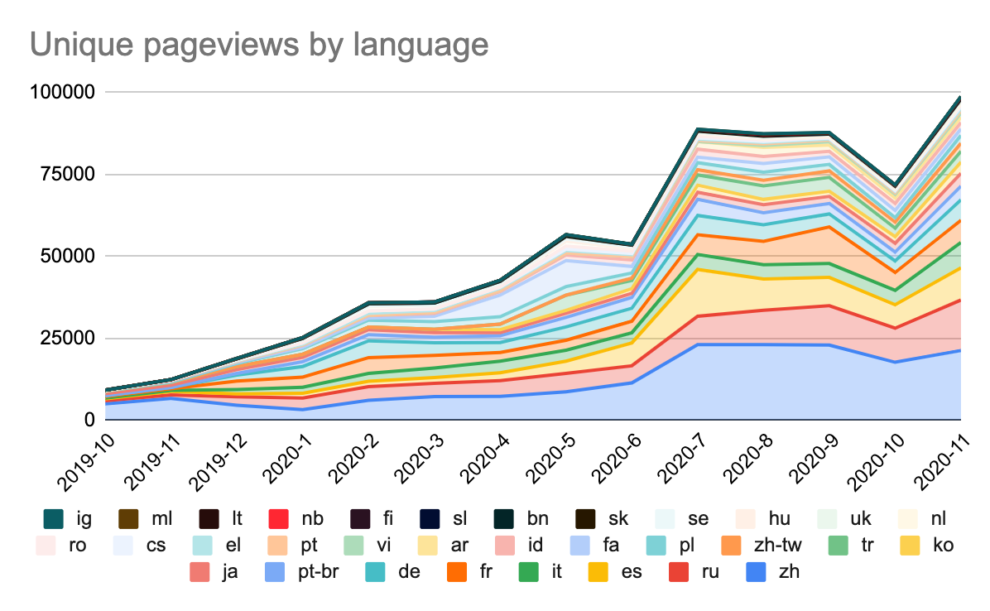 For many of us, 2020 was a challenging year. We deeply appreciate the community’s tireless enthusiasm and ongoing contributions during this difficult time. We are looking forward to continuing our great work with you and to welcoming more volunteers next year. We’re always on the look out for more translators to help us get more folks involved. If you’re aware of anyone that may be interested, please feel free to direct them to the translation program, or to our Discord.