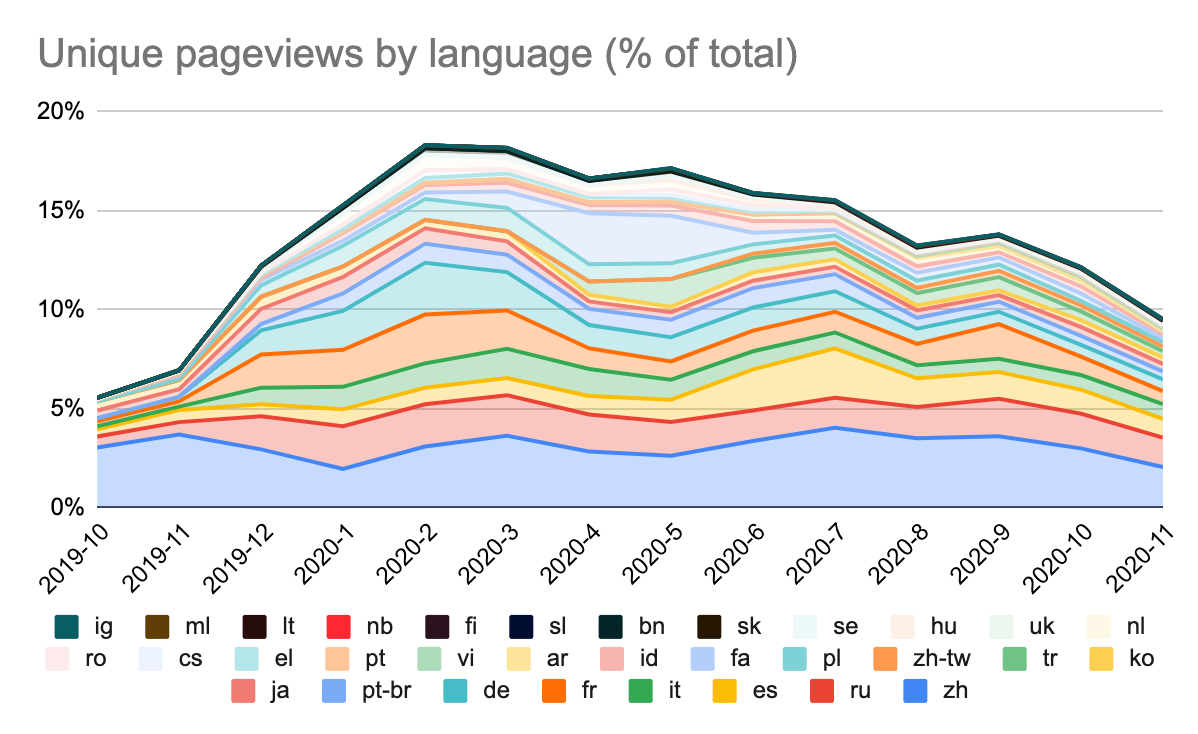 Despite the traffic growth for translated pages, we’ve noticed that the growth relative to overall traffic has gone down this year. As seen below, the pageviews of translated pages reached nearly 20% of total unique pageviews in February but it has declined to 10% in recent months.
