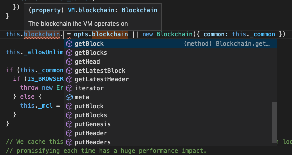 Your development environment with proper TypeScript typing now just knows that a blockchain variable is an @ethereumjs/blockchain object (hold on with your remarks, Go and Rust developers 😅 ) and not just “something”. So our own code gets respectively your (TypeScript) code will get a lot more readable on using the new library versions.