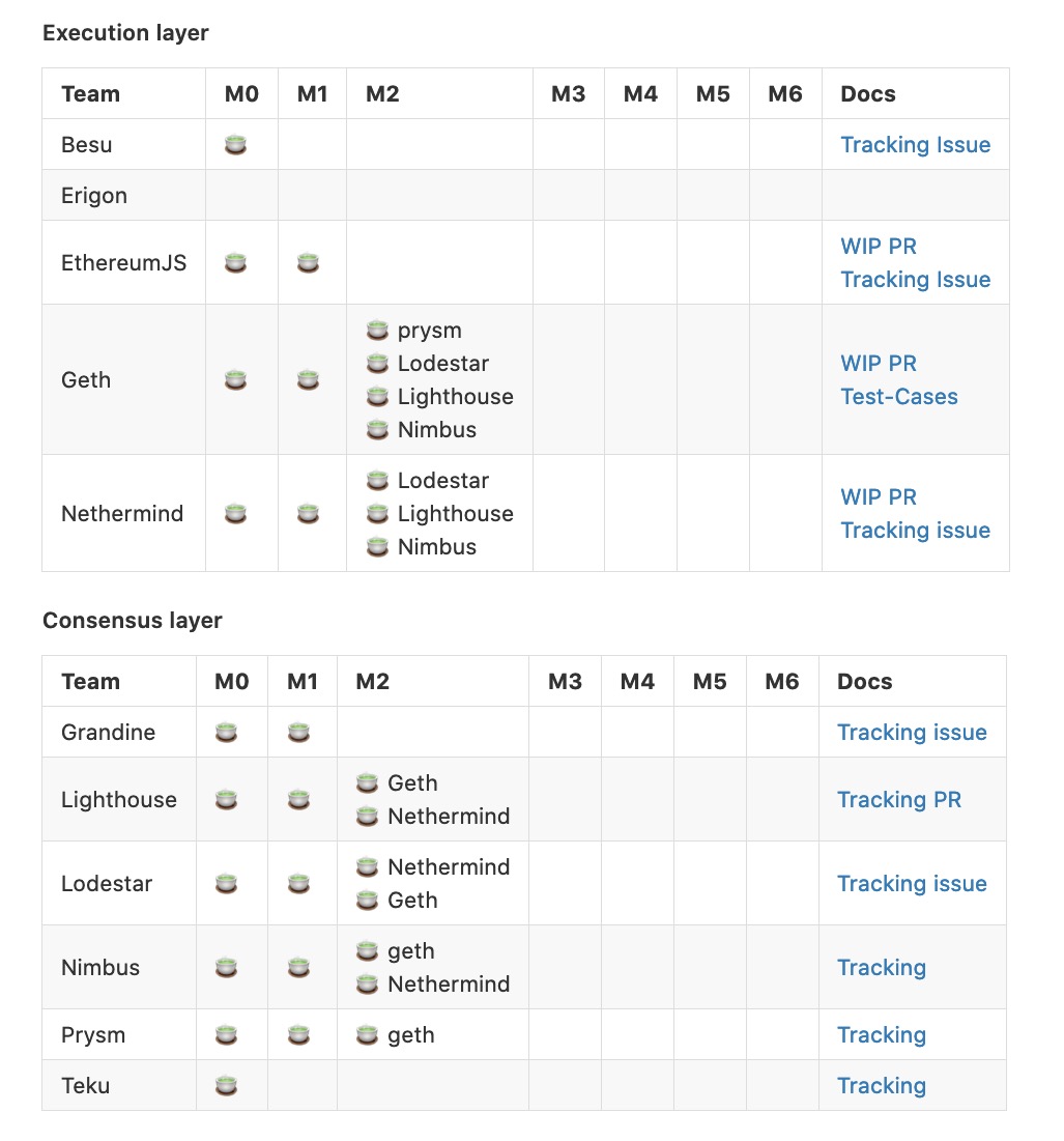 Client teams are currently working through milestones — building out features, running tests, and doing initial interop experiments with other clients. Additionally, a Merge devnet is being launched each week this month — merge-devnet-0 is the latest.