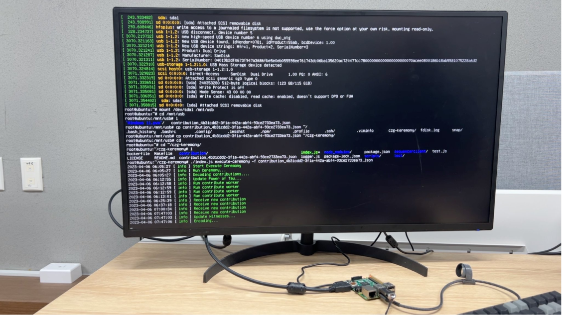 CZG-Keremony is a KZG ceremony client written entirely in JavaScript by the DSRV Labs team. Under the hood, it uses @paulmillr’s [https://github.com/paulmillr/noble-curves](noble-curves BLS implementation), so this is an end-to-end contribution done in pure JS. rootwarp.eth and @kim201212 performed an airgapped contribution on a RaspberryPi 2 before destroying the SD card.
