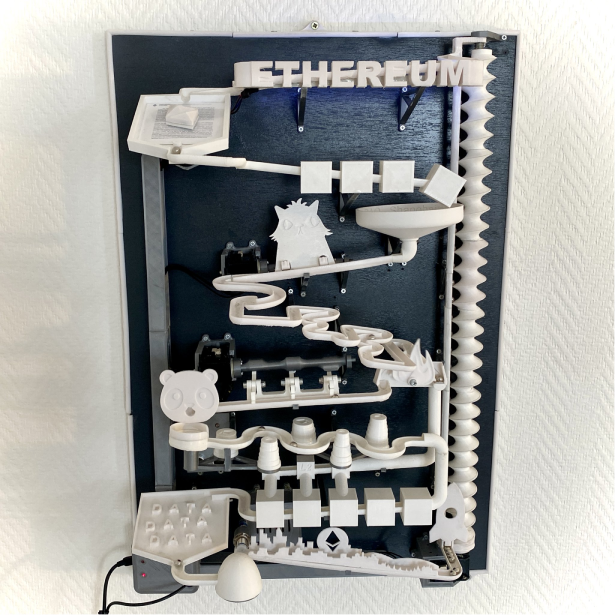 The KZG Marble Machine is an artwork\contraption with different sections of track showing off different phases of Ethereum’s history. The machine uses 23 sensors to measure small fluctuations in each marble’s run as well as various environmental factors to ensure the randomness is unbiased. Read xofee.eth‘s writeup here or even 3D print your own machine.
